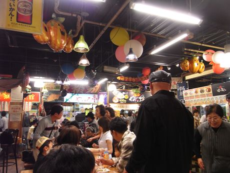 屋台のような小型店舗が集合していて、真ん中にテーブルがあってそこで飲食が出来ます。