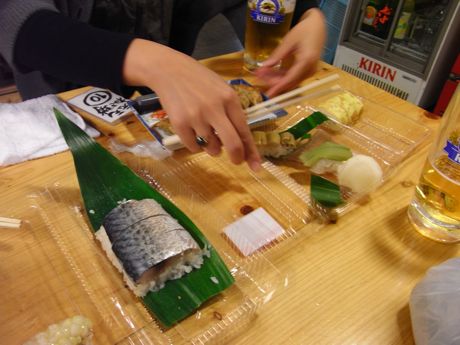 早速、日曜市で買ってきた肴(お寿司)をオープン。
