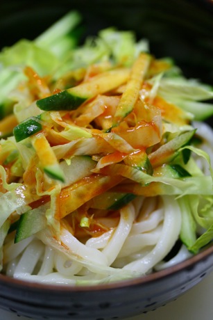 レタスとキュウリの千切りから思いついて、ゴマドレッシングをかけたサラダうどん。