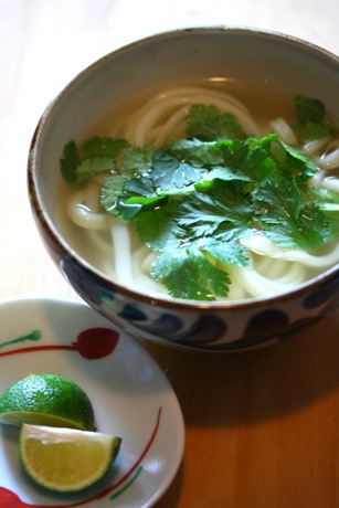 鶏ガラスープの素で適当なスープを作って、ベトナムの麺「フォー」風のうどんに。