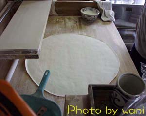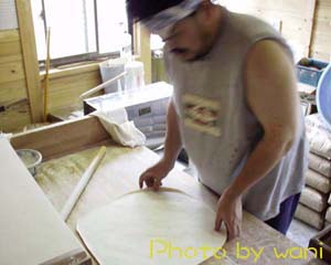 | [延ばし] 角出しして四角なった生地を綿棒に巻き付け本格的に延ばしていきます。讃岐では手前から巻き付けていき、巻き付けた生地を手元に戻すときにトントンと打ち代にうちつける「すかし打ち」という方法が使われますが僕はまだ理解できていません(^^; |