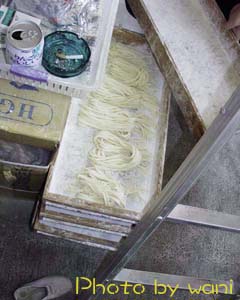 | [切り終わった麺] ちょっと太めですが、綺麗な麺が出来上がりました。これで私の作業は終わり。ほっと一息です。 |